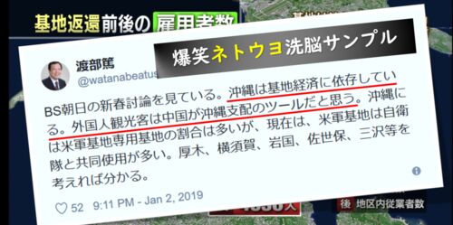 軍雇用、驚くほど少ないんですよ、ご存知でしたか。 基地がリゾート地に…沖縄経済“脱基地”への確かな自信|ニュース詳細|報道ステーション|テレビ朝日 未だにこんな電波な元国会議員のような人物が出没する。沖縄は本当に「基地経済に依存」しているのか。…