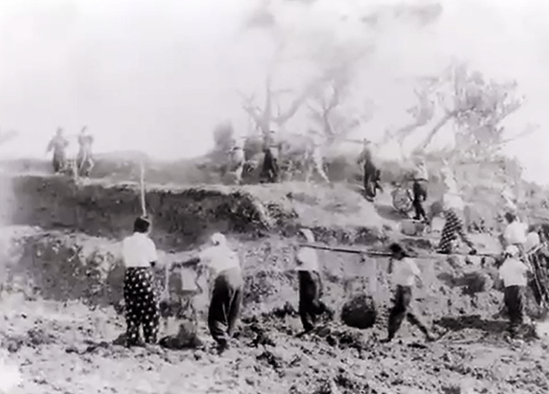 モッコと担ぎ棒で壕の構築に動員される八重山農学校女子部の学徒