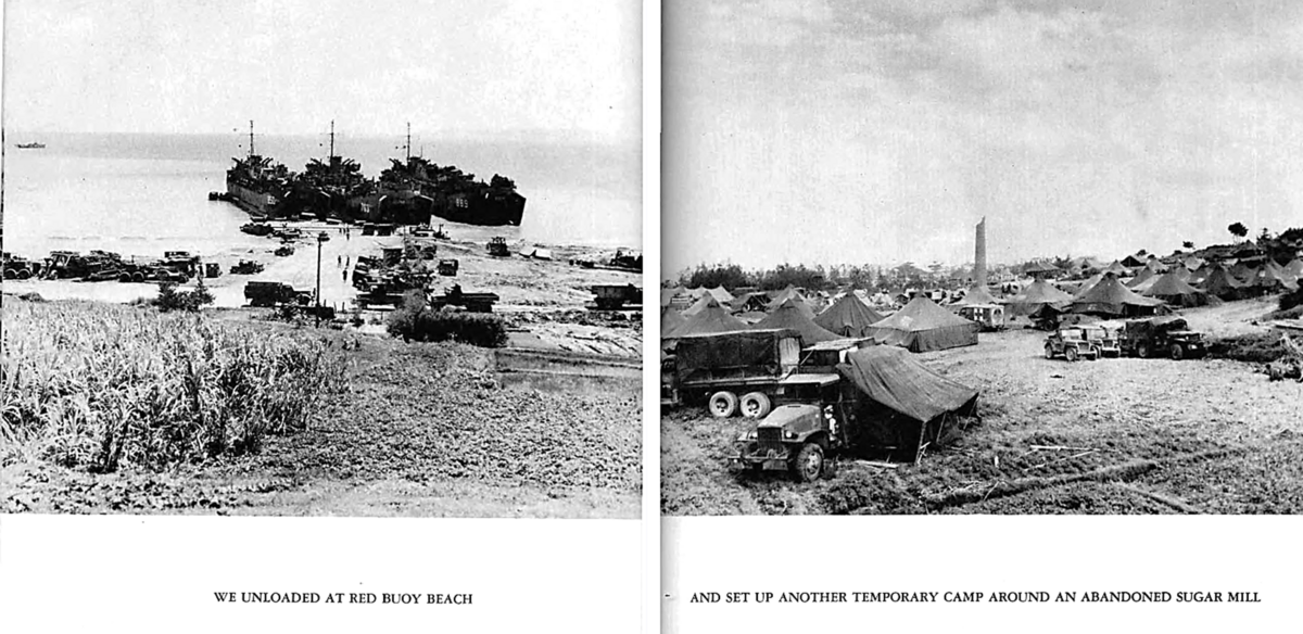 (サイパンにて) 私たちの (次の) ターゲットエリアは暗号で「BIVE」と呼ばれていました。すぐにそれが沖縄のことだと分かりました。(訓練用) 仮設キャンプはすぐに設置されました。テントが立ち上がり、数日後には食堂が使えるようになった。準備作業が開始された後、カービン銃が支給され、射撃訓練が始まりました...月末までに、我が琉球が艦隊によって爆撃されているというニュースが入りました...そして復活祭の日曜日、食堂のラジオが次のように発表しました。沖縄は侵略されました。翌日、トラックが私たちの将来の家への積み込みを開始し、すべての準備作業が確保され、週末までに第1梯団に予定されている約700人のLSTリストが掲載されました。爆弾処理部隊、測量隊員、給水隊員を含む51人の先遣隊が選ばれていた。彼らは11日に出発した。