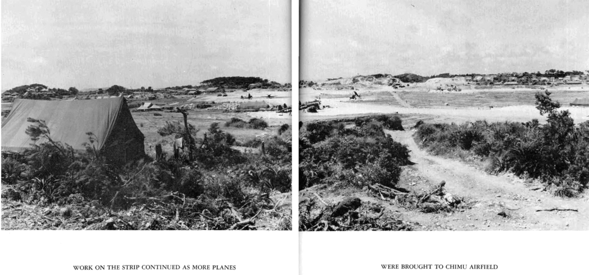 場所 チム飛行場 (金武飛行場) は、日本の 沖縄本島の東海岸、金武近くにあります。建設 1945年4 月下旬、アメリカ海軍 (USN) 第 40 海軍建設大隊 (40th CB) の「シービーズ」がこの地域の飛行場建設を調査。1945年5月6日、戦闘機飛行場として使用する単一滑走路の建設が開始された。建設中、敵の迫撃砲と狙撃兵の射撃により建設が妨げられることあり。1945年7月1日までこの場所に 5,000 フィート x 300 フィートの単一滑走路が完成。管制塔は滑走路を見下ろす高い崖の上にあった。1945年7 月中に、アメリカ海軍は近くにチンブ水上飛行機基地も建設したが、1945年9月と10月に台風で被害を受けたため使用を中止した。