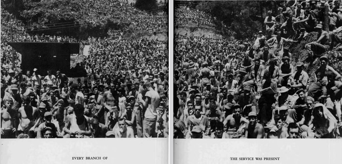 何時間も働いた後は時間がゆっくりと単調に過ぎていましたが、8月の間はちょっとした娯楽がその時間を和らげてくれました。私たちは 2 つのステージショーを行いました。1 つ目は沖縄住民の宗教的なダンスをフィーチャーし、2 つ目はケイ・カイザーと彼の一座をフィーチャーしました。バンドリーダー、カイザーの観客は、手作りの椅子や座席用の配給箱を抱えて、早朝から映画エリアになだれ込み始めた。太陽は暑くて重く、カイザーが到着するまでに聴衆は数千人になっていた。アメリカの女の子たちにまた会えて嬉しかったです。