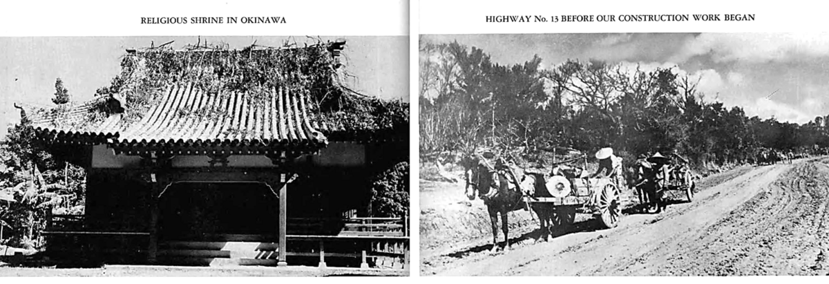 私たちは荷を下ろした海岸の近くに一時的なキャンプを設営しました。数日後、私たちは人口2万人の金武町に移りましたが、そのほとんどが老人と子供のようでした。私たちが到着してから数日後、金武の子供たちは、文字通り大群で、私たちからタバコや食糧をむしり取り、通り過ぎるトラックに向かって「ハバ、ハバ」(Haba-Haba) と叫びました。 7月までに (6月20日に)、私たちが「グーク」(Gooks) と呼んでいた沖縄人が島の北部に移住させられ、町は私たちの人員と装備によって破壊され、ゴーストタウンになりました。瓦礫の山だけが残った。