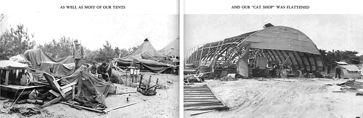私たちのキャンプ場は台風で二度被害を受けました。最初の被害の修復がほとんど終わっていないうちに、2件目の被害が発生し、キャンプはほぼ完全に破壊されました。テント、事務所、店舗、食堂も同様に廃墟となった。クオンセットの小屋は、嵐の最中にねじれ、コンクリートの基礎から引き裂かれました。もう一度キャンプを築き直しましたが、みんな帰ることを考えていたので中途半端でした。大隊は元の規模の 3 分の 2 に縮小し、毎月より多くの兵士が部隊を離れることになった。しかし、私たち全員にとって、民間生活はそれほど遠いものではありませんでした。私たちはそれをありがたく思いました...